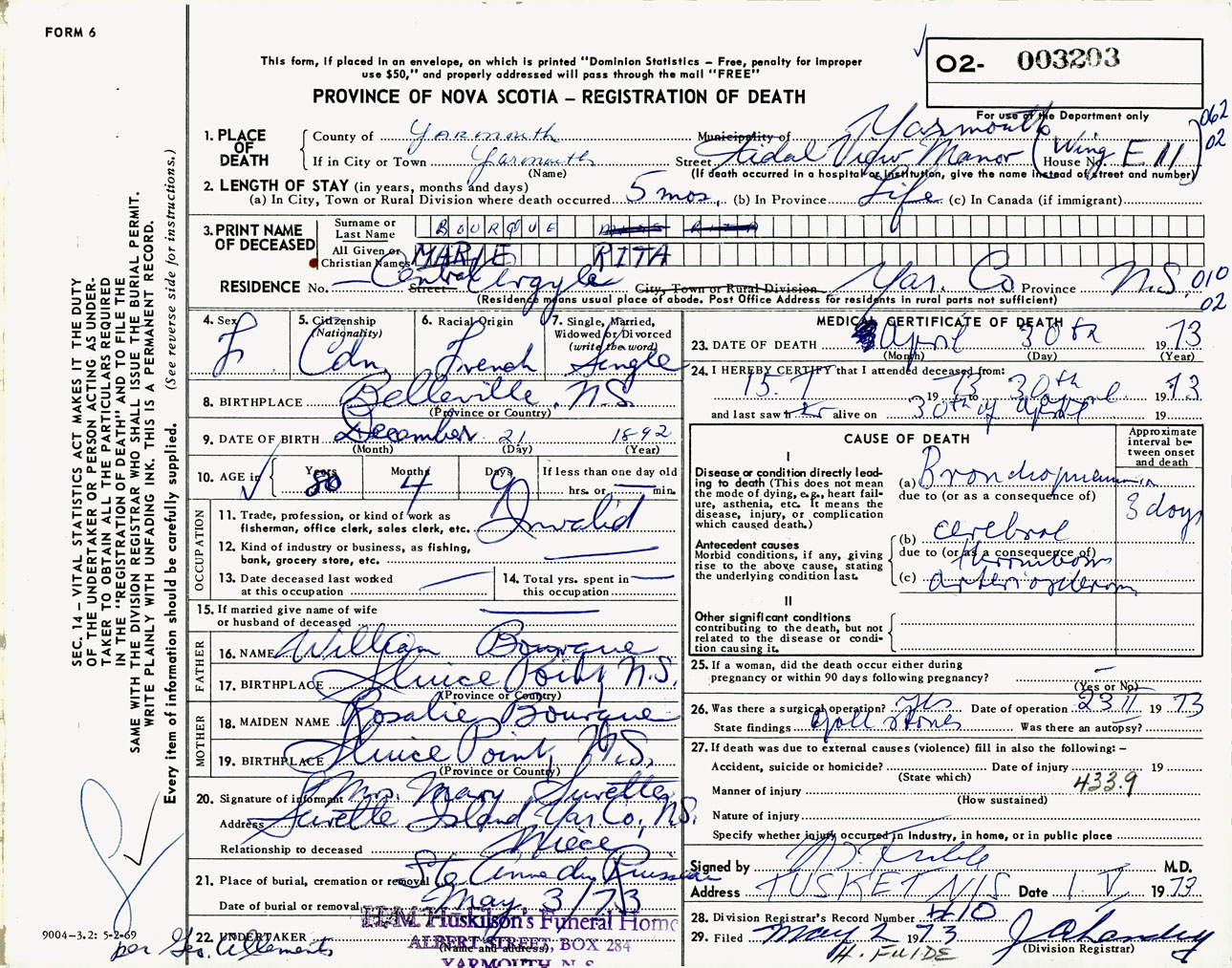 Female Death Registration: Year: 1973 number: 3203