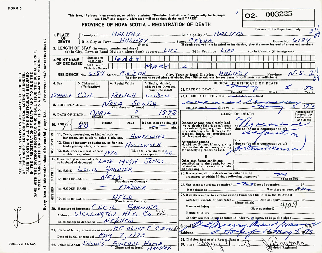 Female Death Registration: Year: 1973 number: 3225