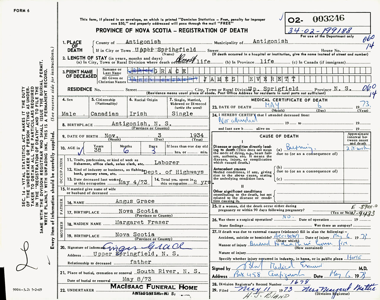 Male Death Registration: Year: 1973 number: 3246