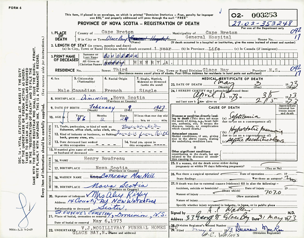 Male Death Registration: Year: 1973 number: 3253
