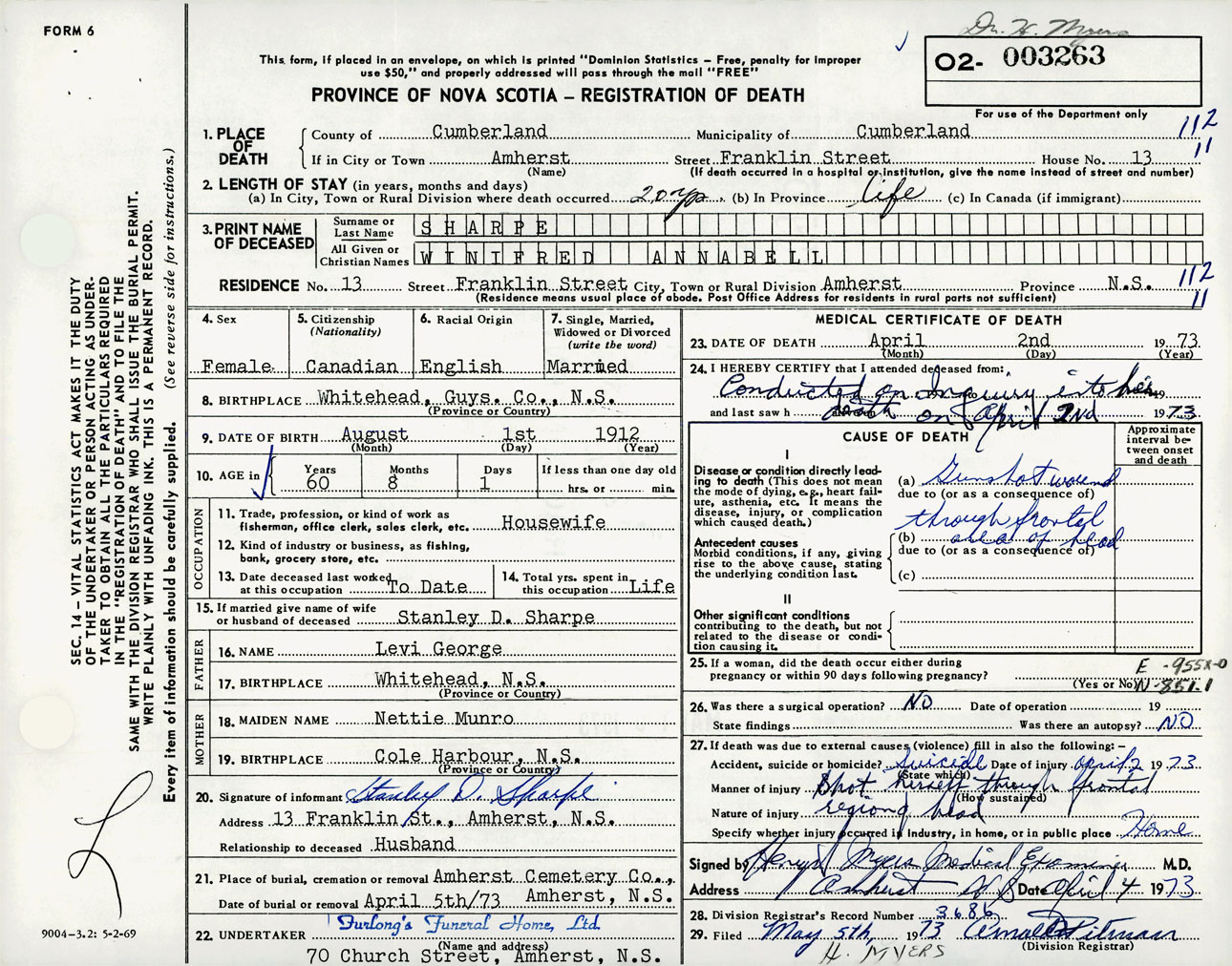 Female Death Registration: Year: 1973 number: 3263