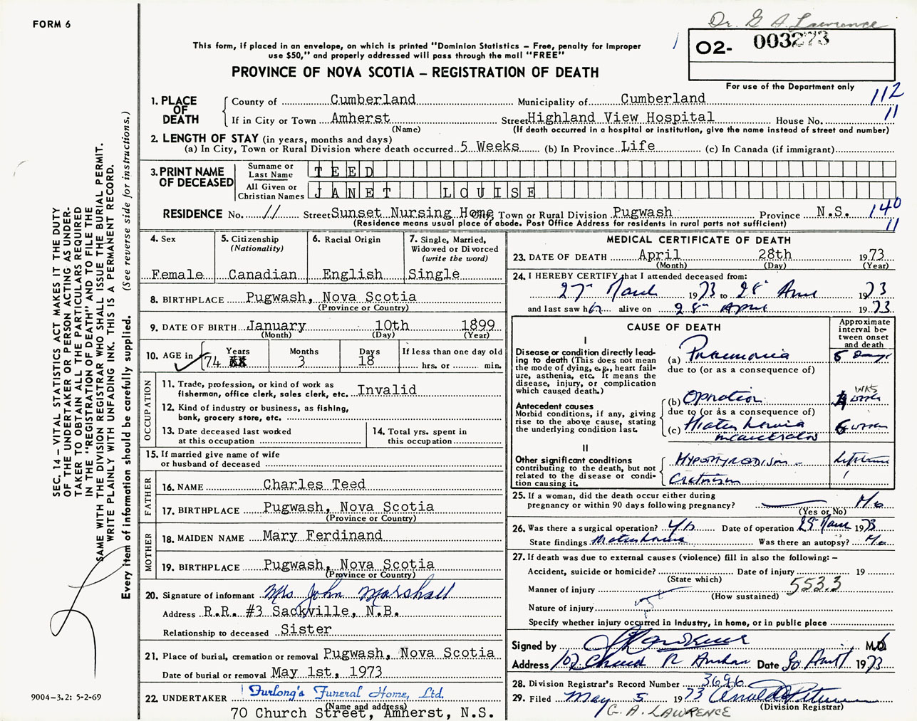 Female Death Registration: Year: 1973 number: 3273