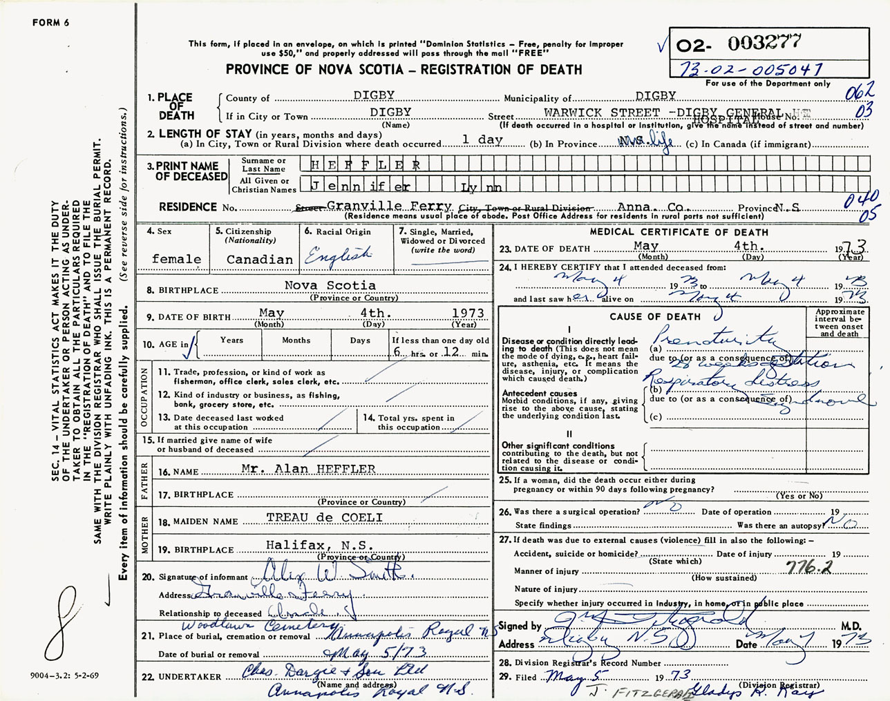 Female Death Registration: Year: 1973 number: 3277