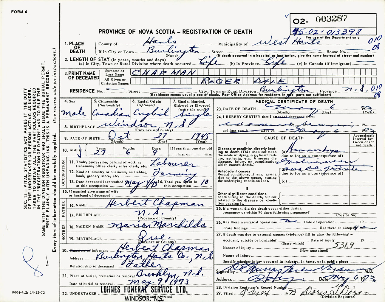 Male Death Registration: Year: 1973 number: 3287