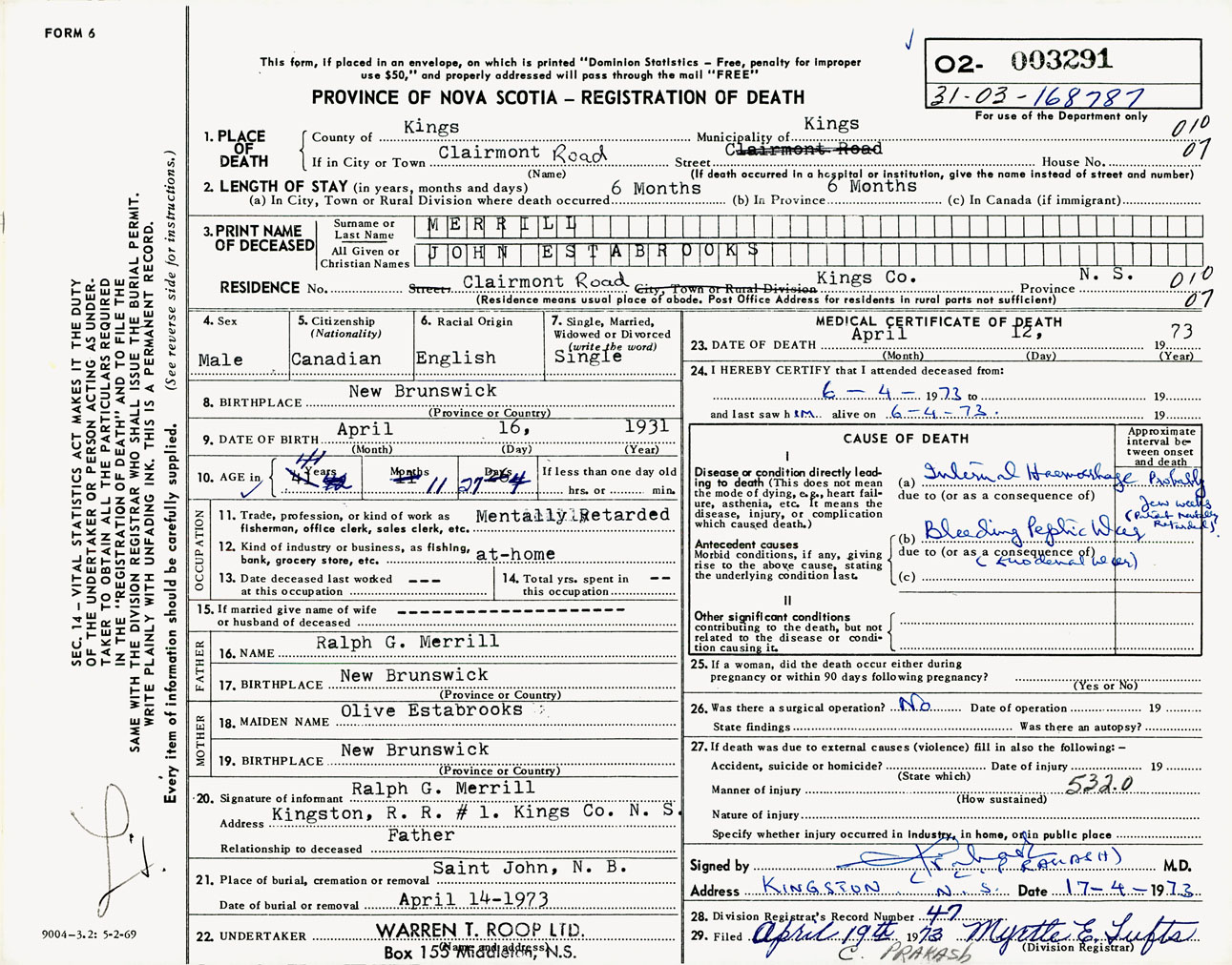 Male Death Registration: Year: 1973 number: 3291