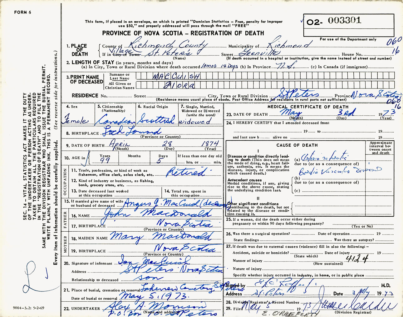 Female Death Registration: Year: 1973 number: 3301