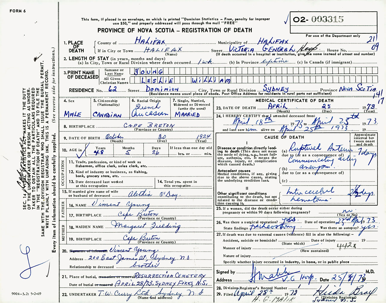 Male Death Registration: Year: 1973 number: 3315