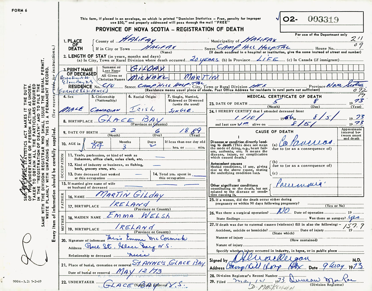 Male Death Registration: Year: 1973 number: 3319