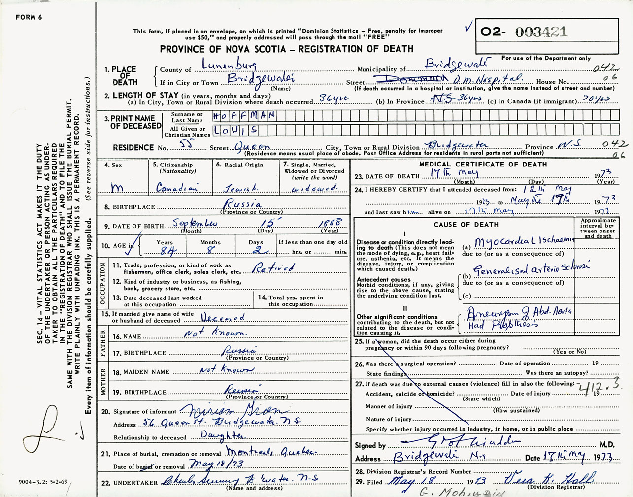 Male Death Registration: Year: 1973 number: 3421