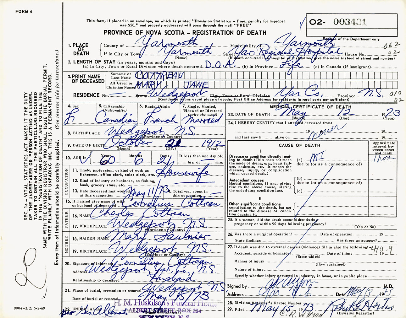 Female Death Registration: Year: 1973 number: 3431