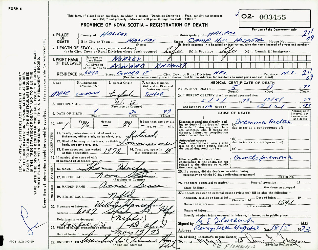 Male Death Registration: Year: 1973 number: 3455