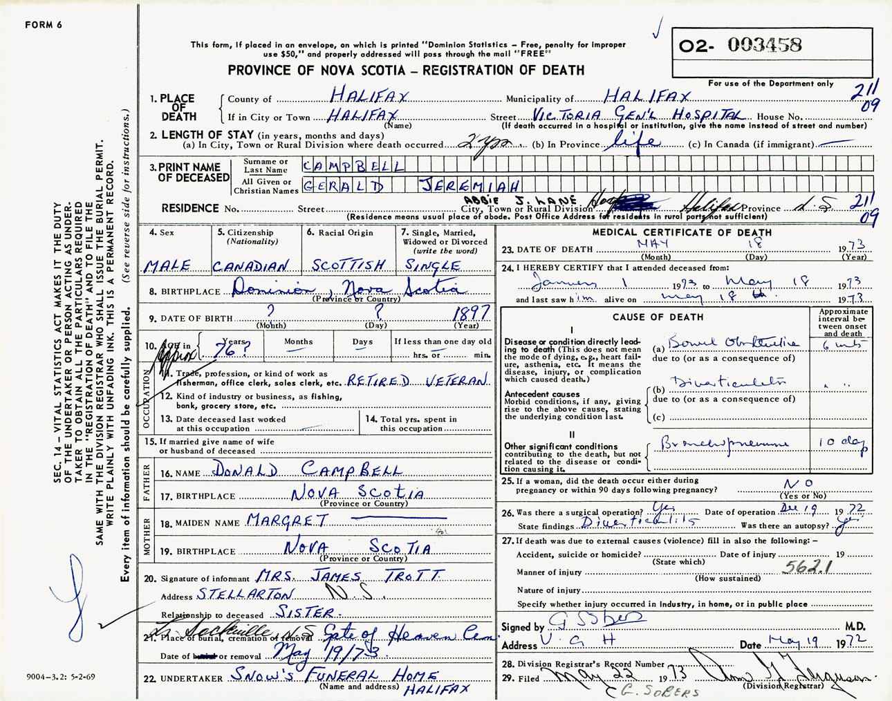 Male Death Registration: Year: 1973 number: 3458