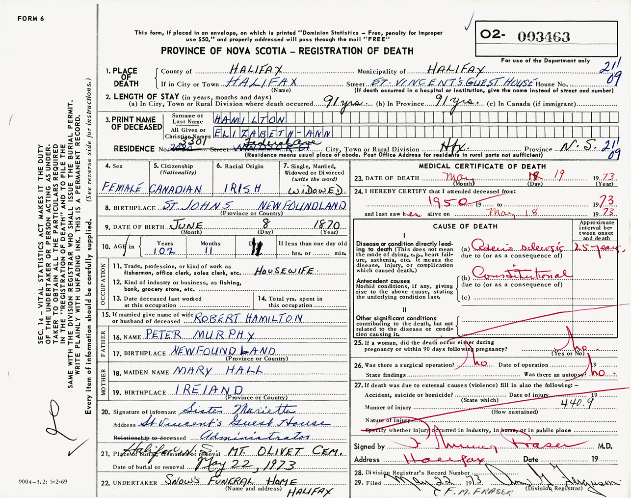 Female Death Registration: Year: 1973 number: 3463
