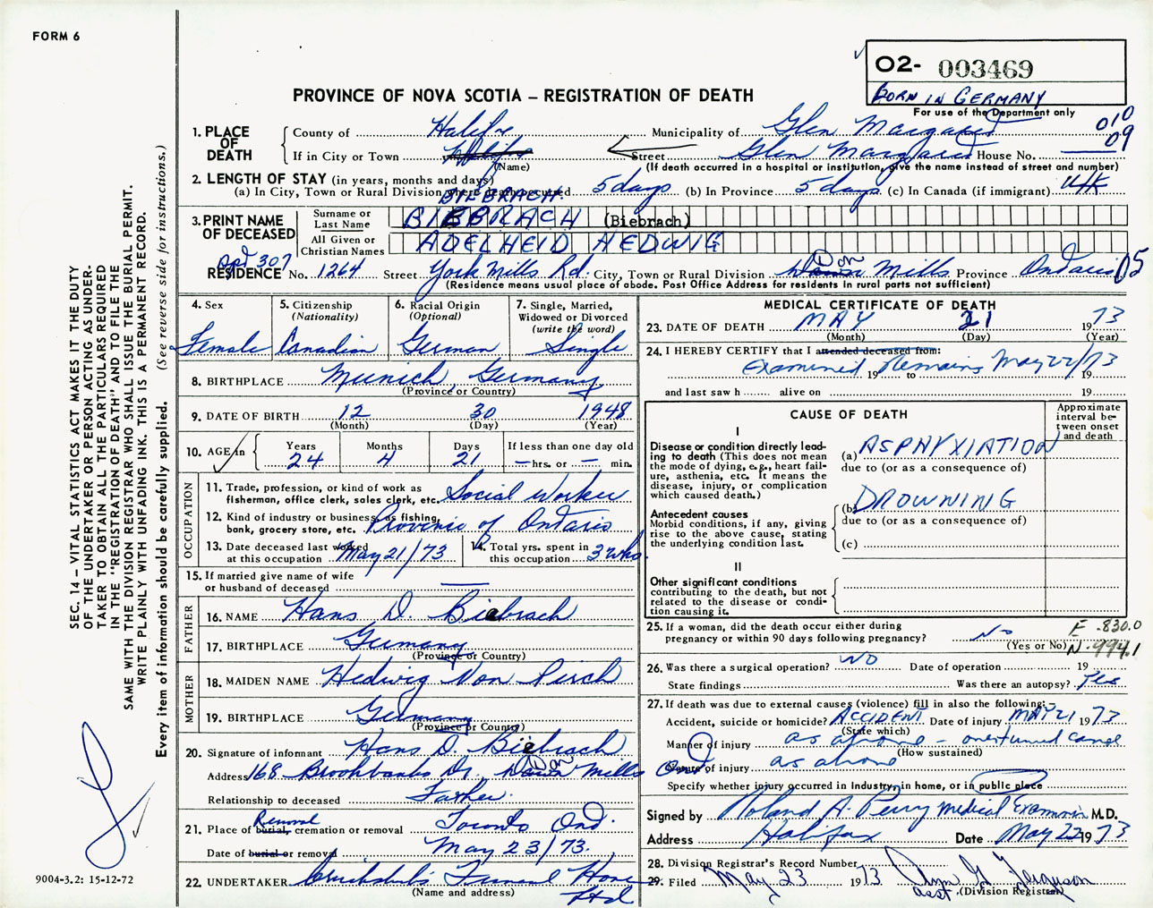 Female Death Registration: Year: 1973 number: 3469