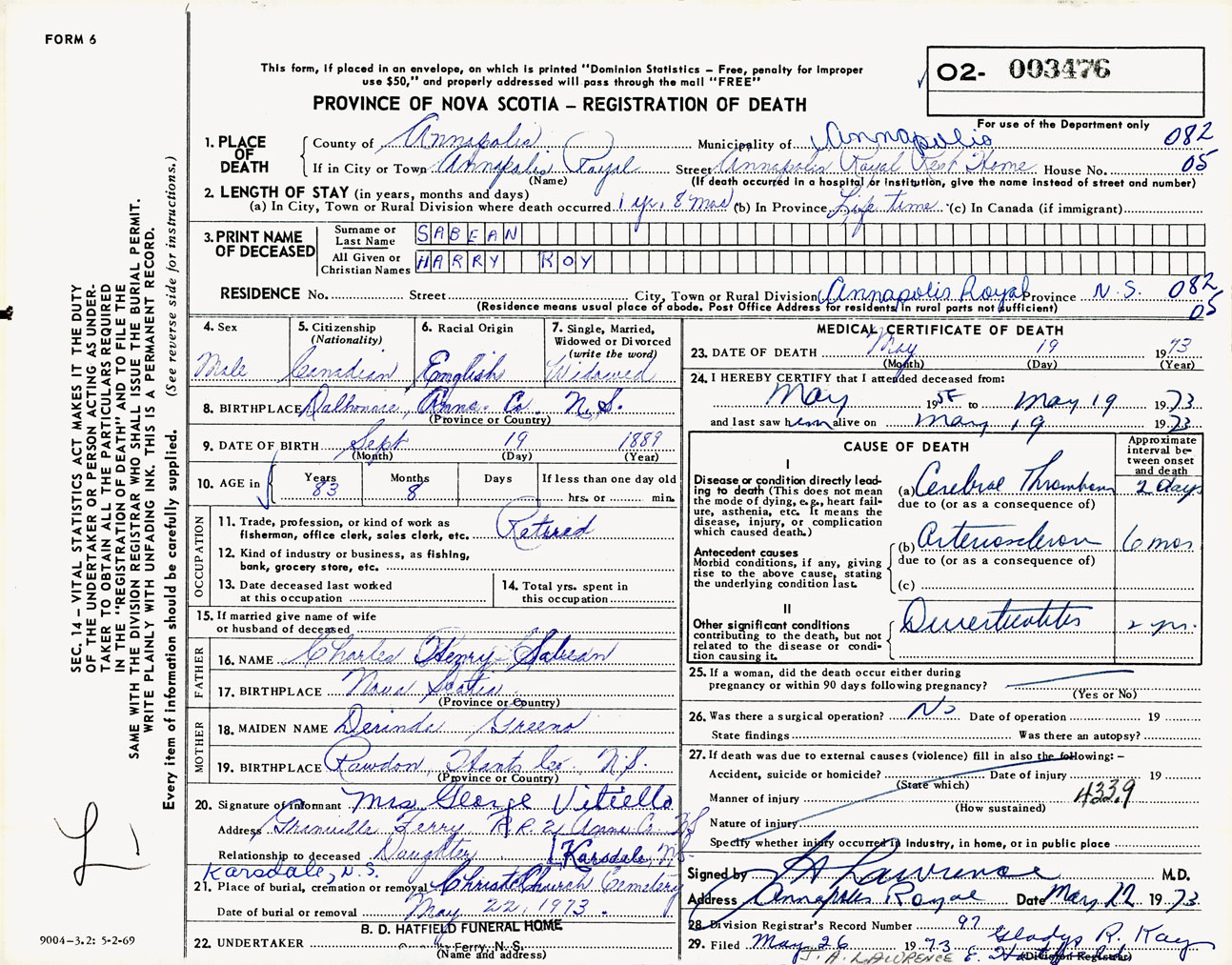 Male Death Registration: Year: 1973 number: 3476
