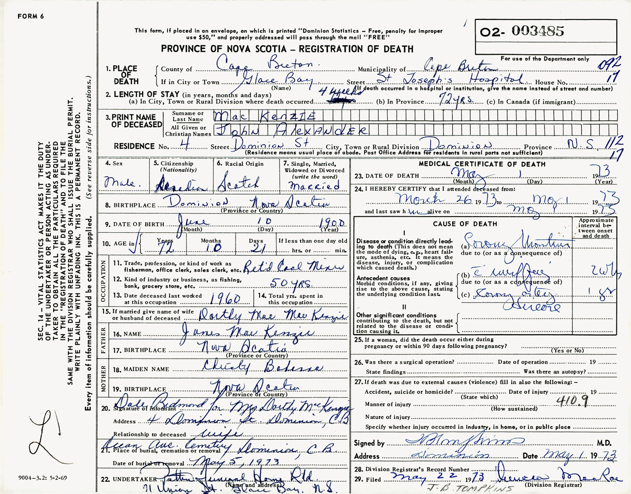 Male Death Registration: Year: 1973 number: 3485