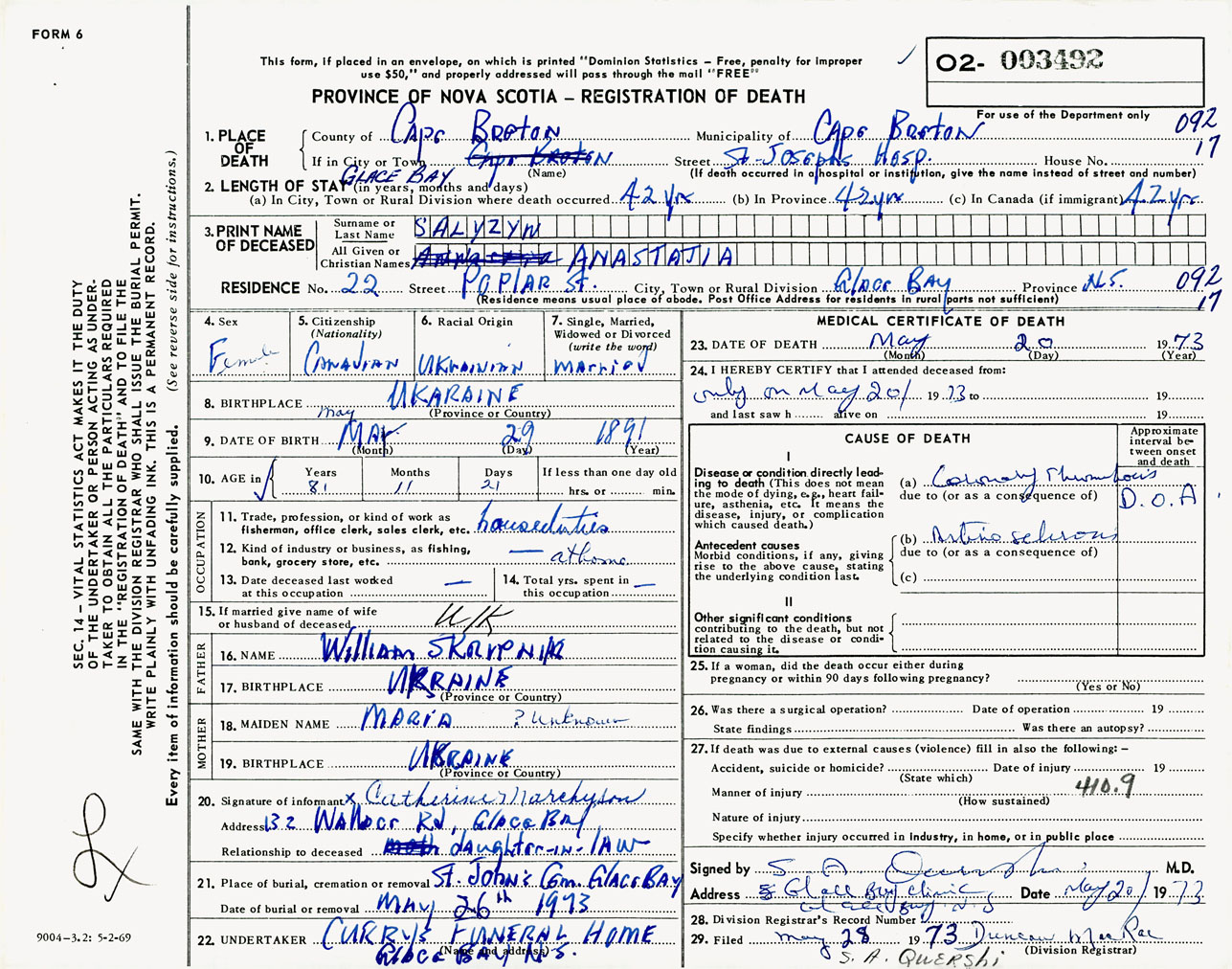 Female Death Registration: Year: 1973 number: 3492