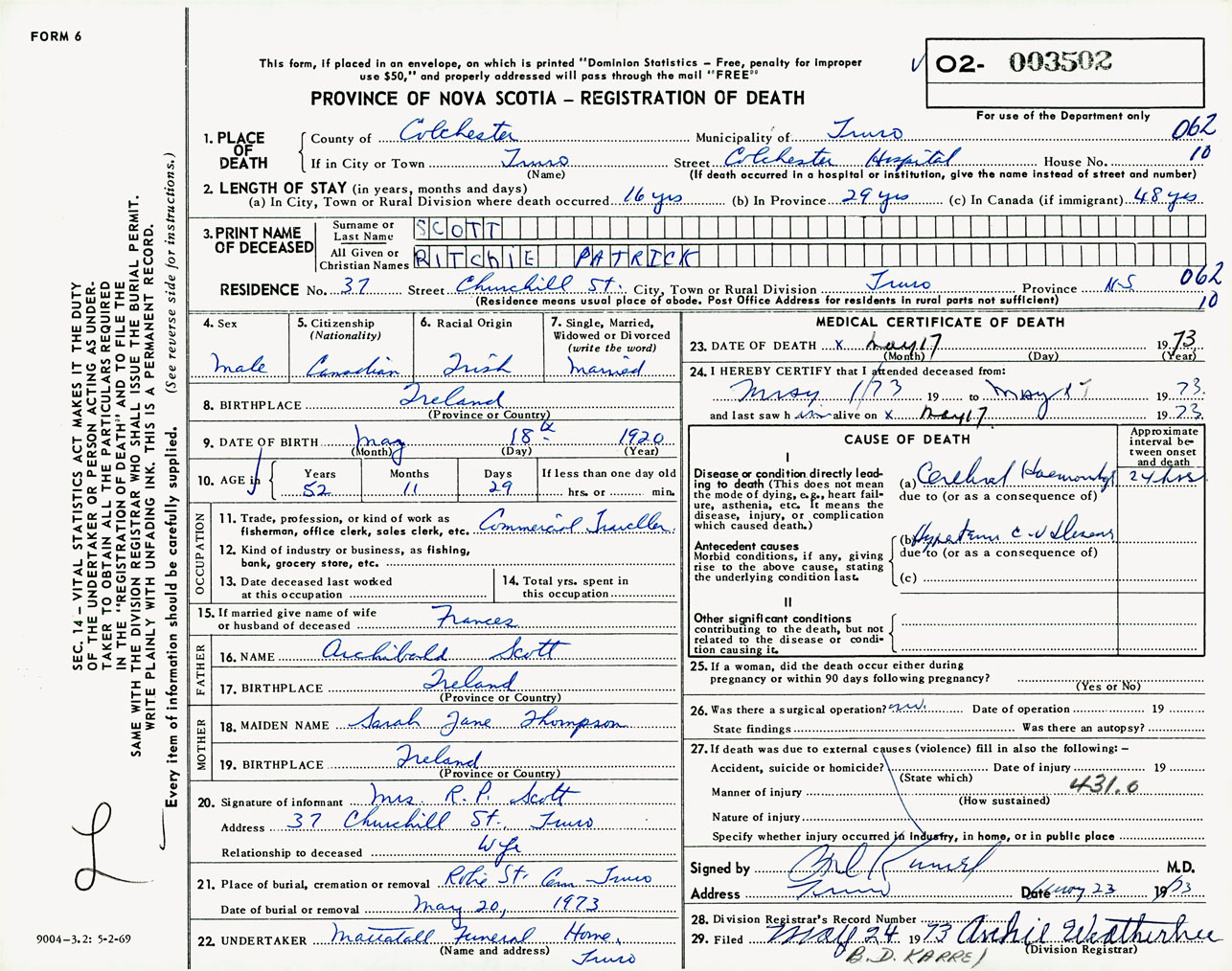 Male Death Registration: Year: 1973 number: 3502