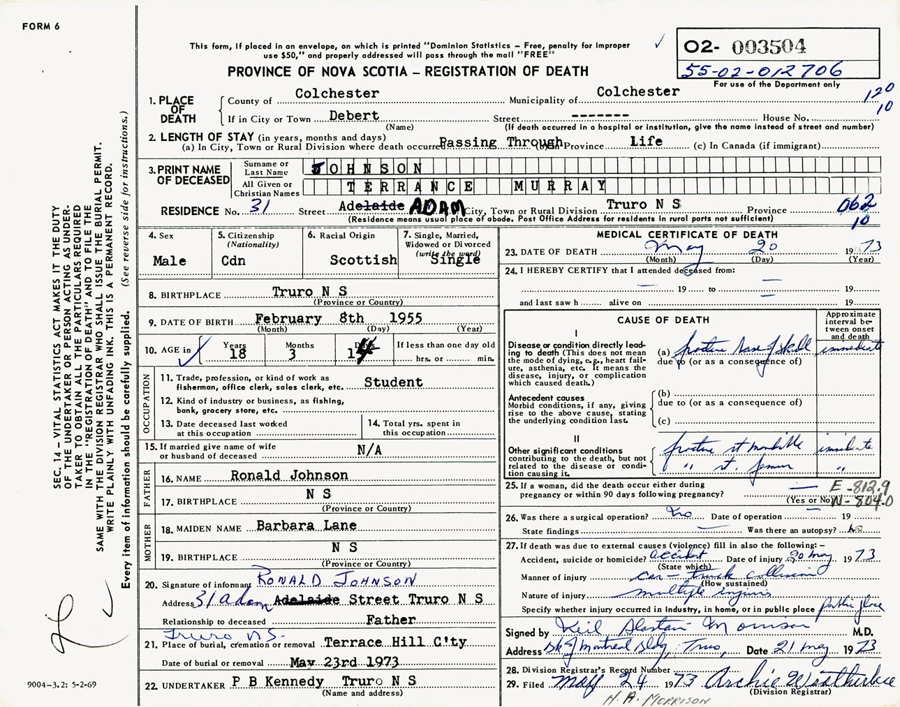 Male Death Registration: Year: 1973 number: 3504
