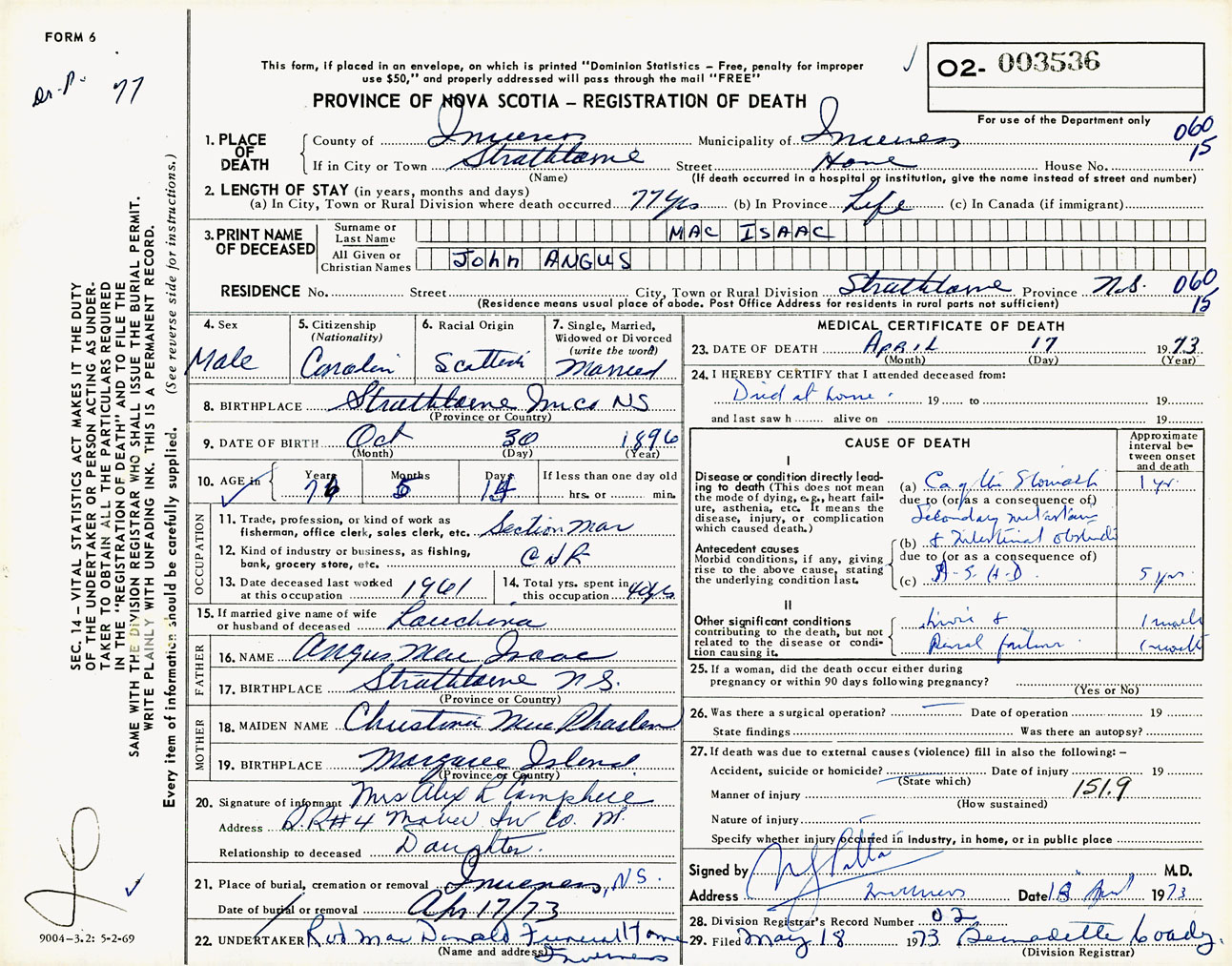 Male Death Registration: Year: 1973 number: 3536