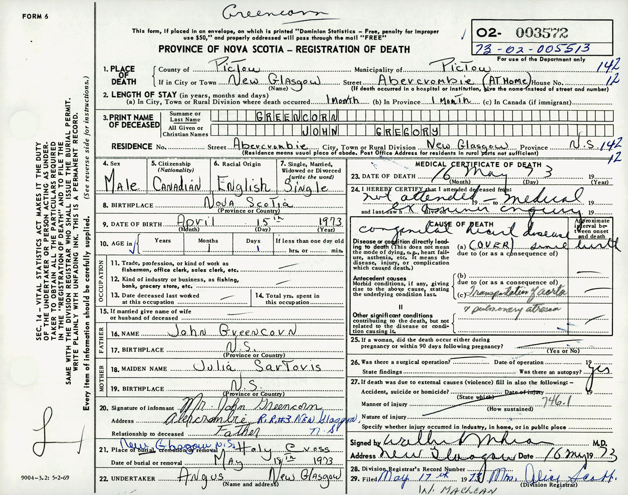 Male Death Registration: Year: 1973 number: 3572