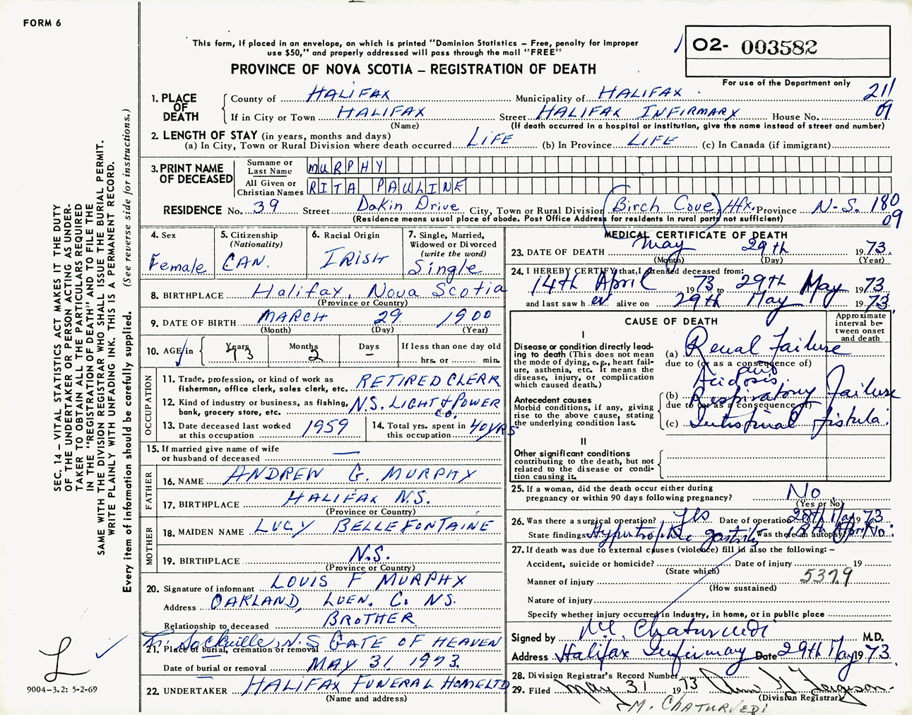Female Death Registration: Year: 1973 number: 3582