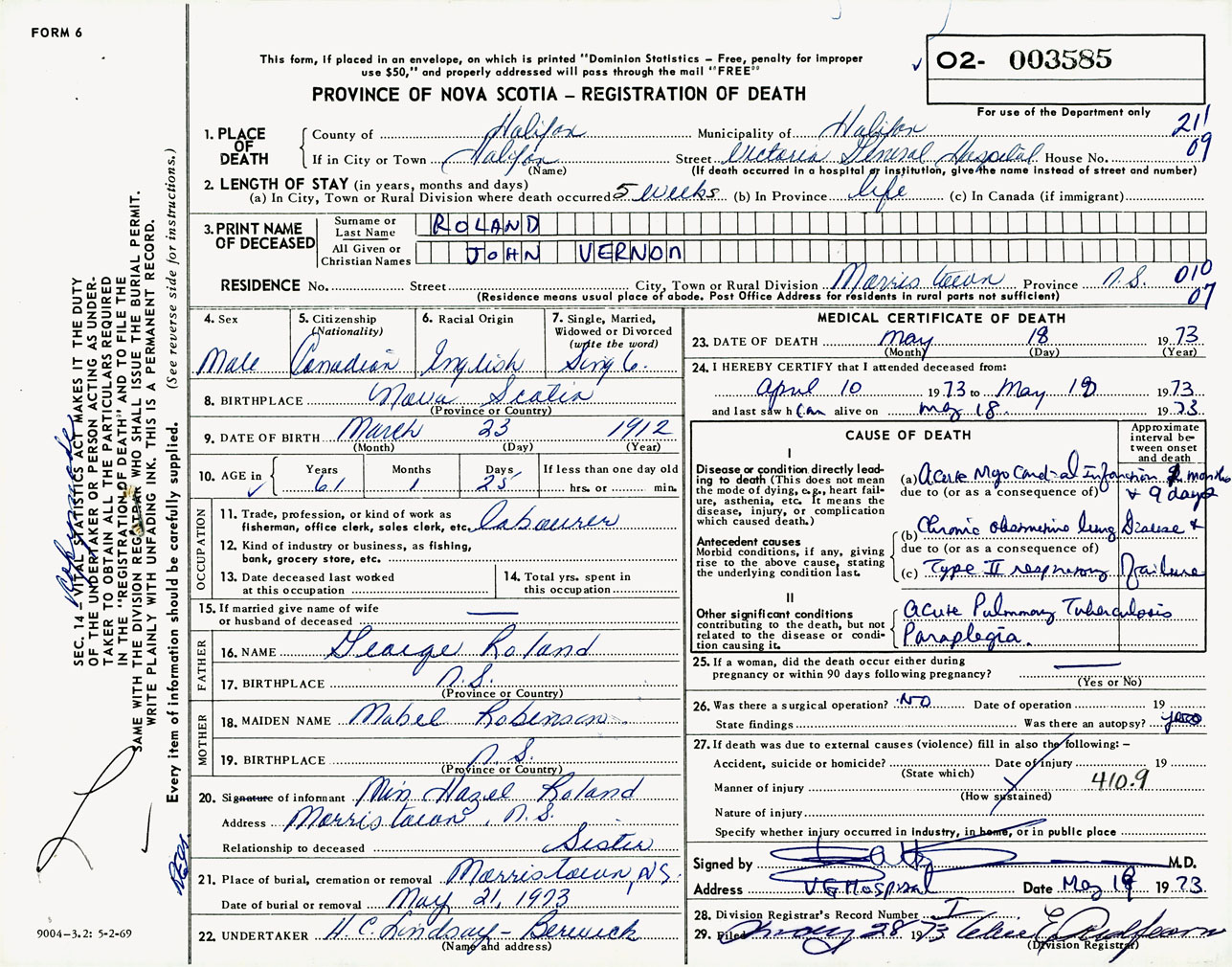 Male Death Registration: Year: 1973 number: 3585