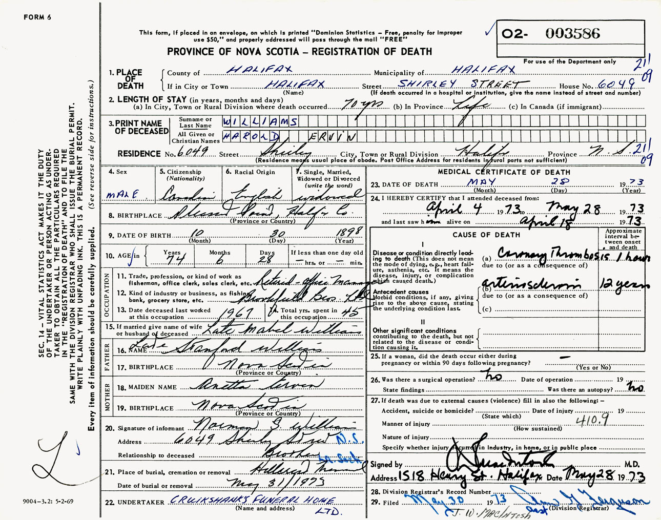 Male Death Registration: Year: 1973 number: 3586
