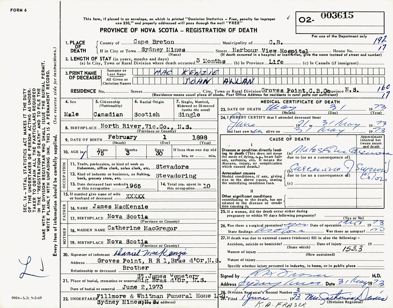 Male Death Registration: Year: 1973 number: 3615