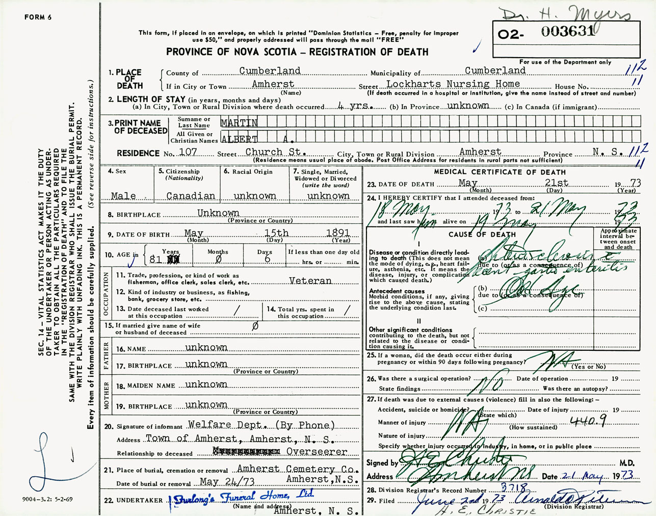 Male Death Registration: Year: 1973 number: 3631