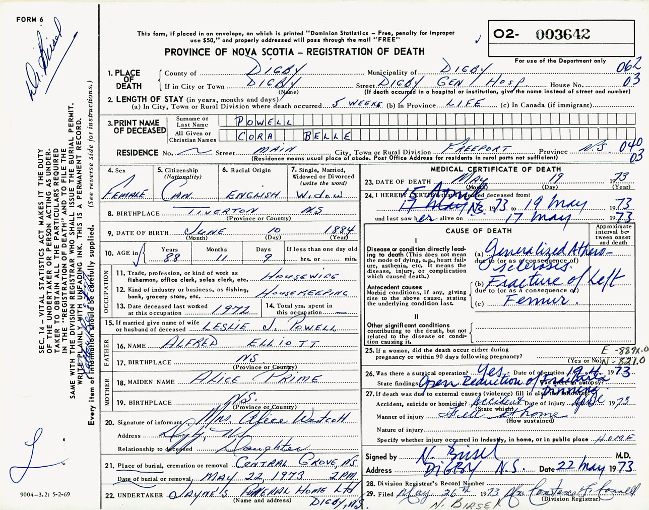 Female Death Registration: Year: 1973 number: 3642