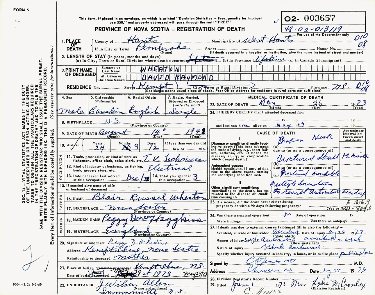 Male Death Registration: Year: 1973 number: 3657
