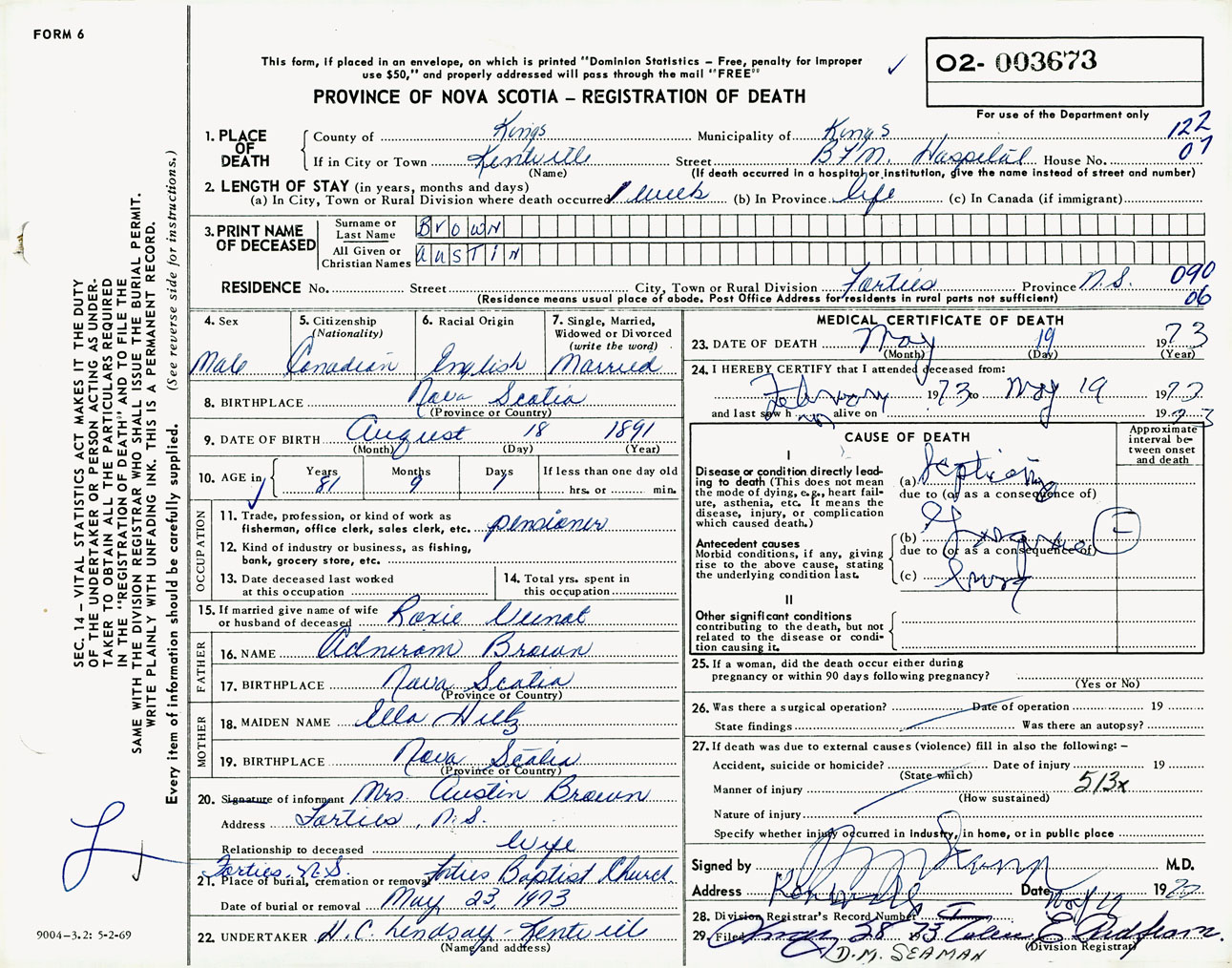 Male Death Registration: Year: 1973 number: 3673