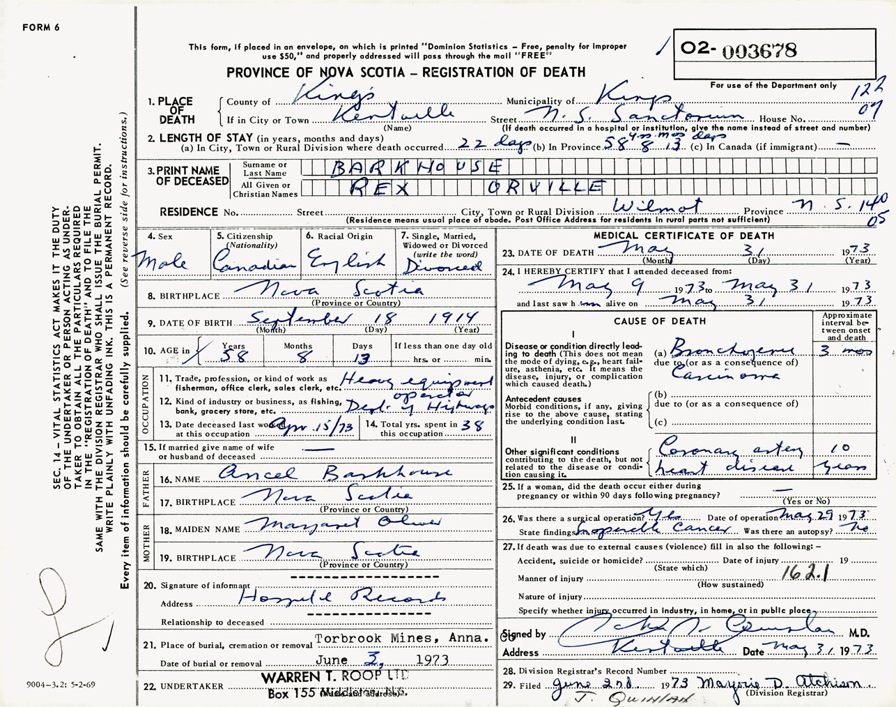 Male Death Registration: Year: 1973 number: 3678
