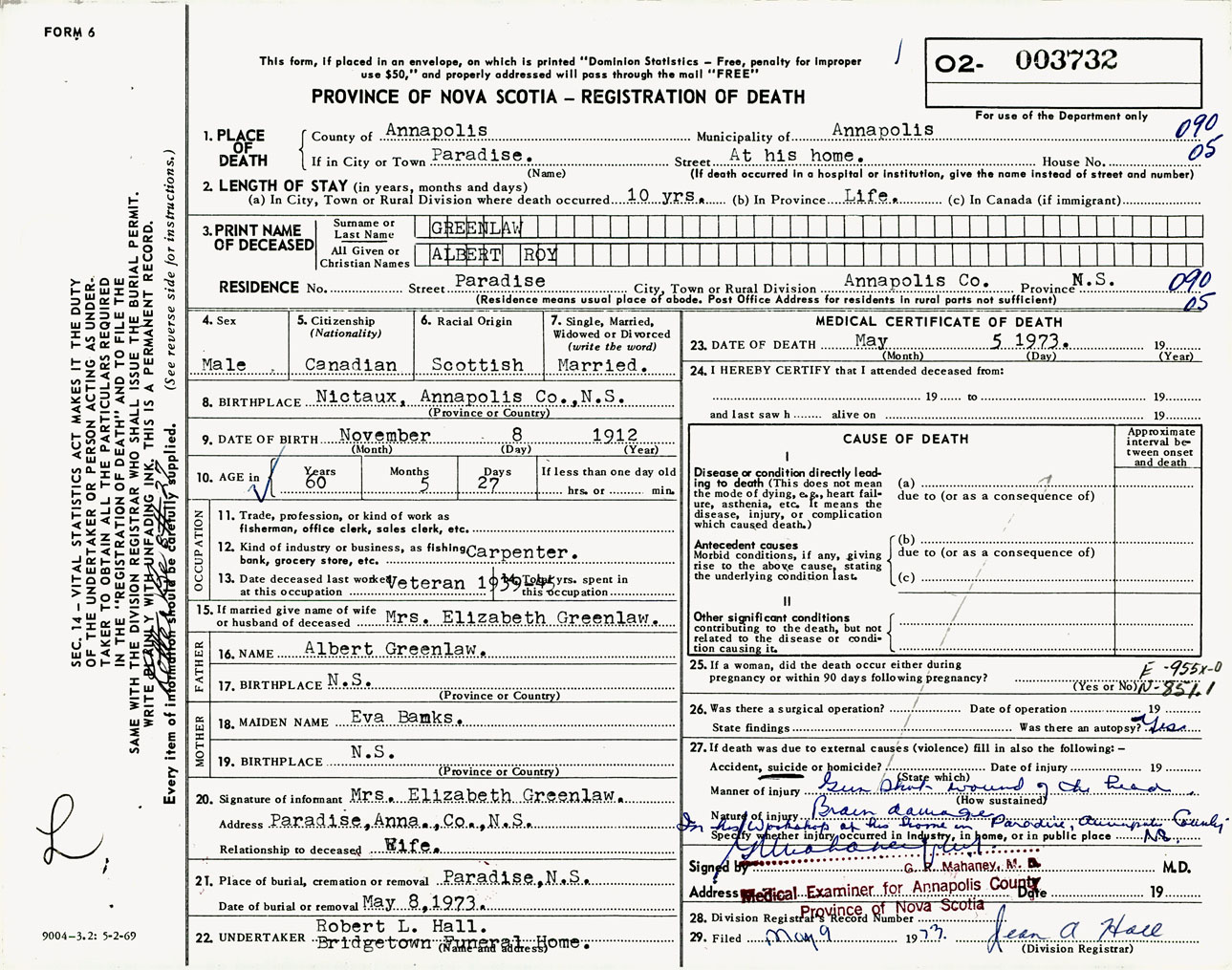 Male Death Registration: Year: 1973 number: 3732