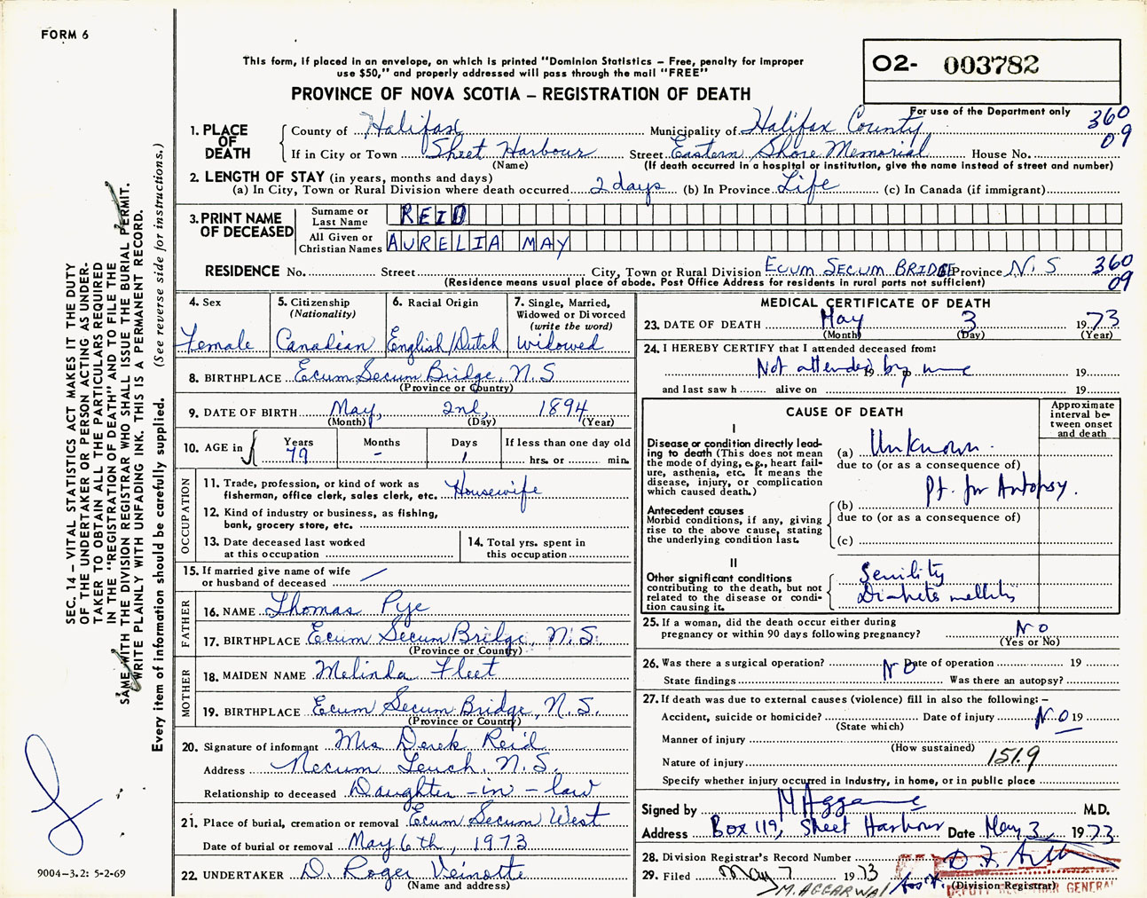 Female Death Registration: Year: 1973 number: 3782
