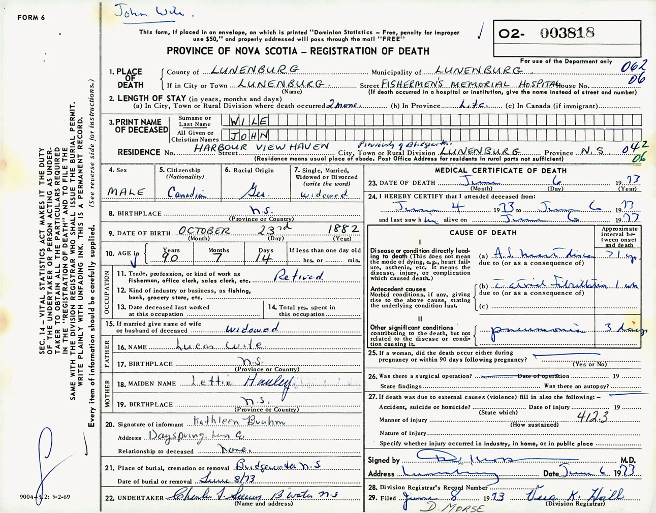 Male Death Registration: Year: 1973 number: 3818