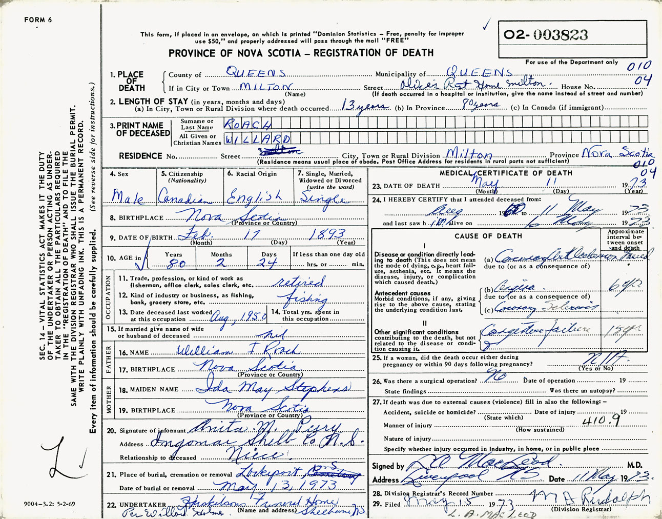 Male Death Registration: Year: 1973 number: 3823