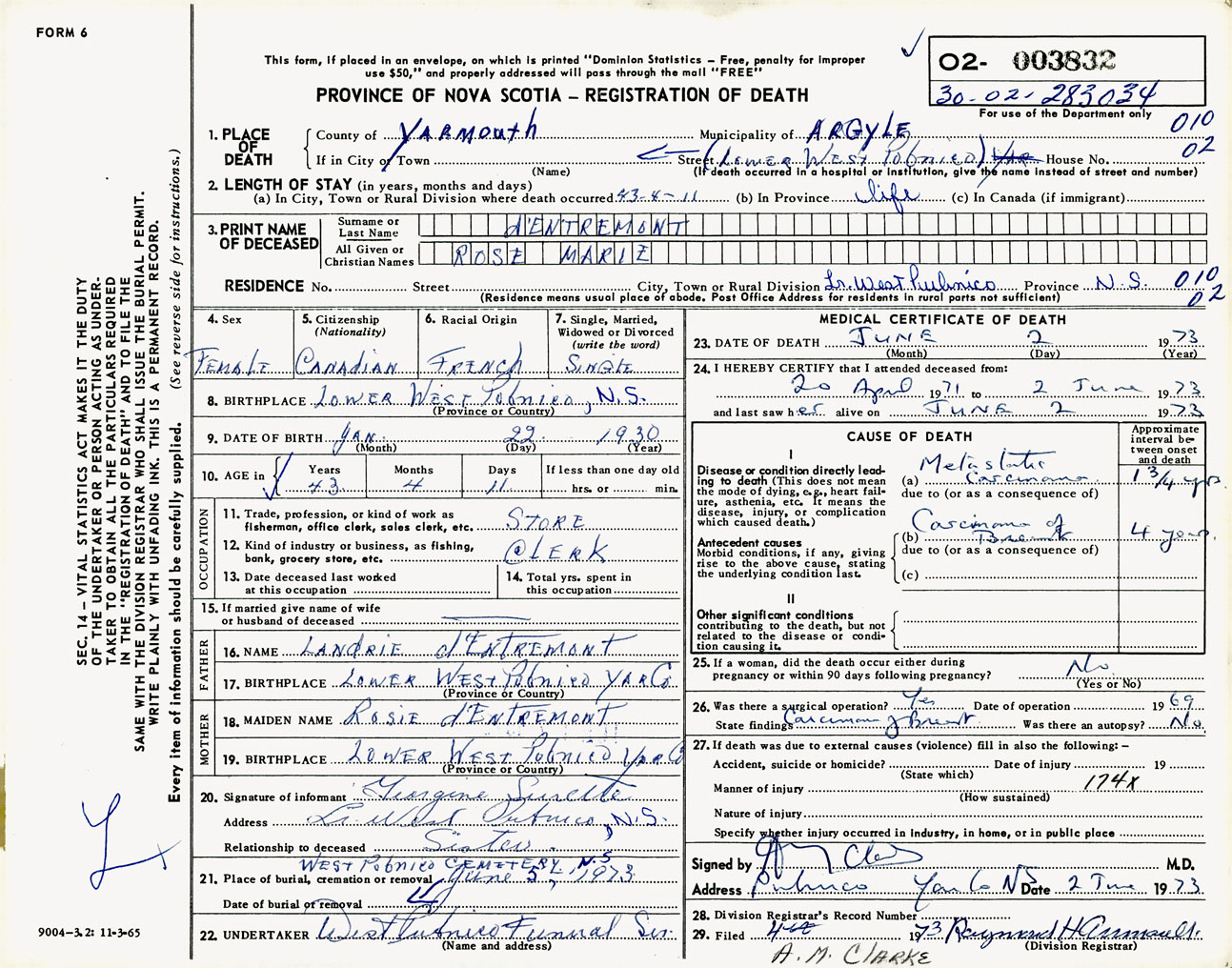 Female Death Registration: Year: 1973 number: 3832