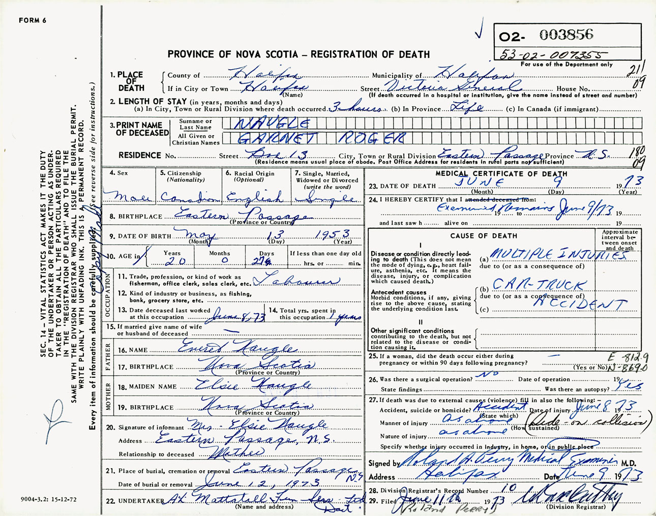 Male Death Registration: Year: 1973 number: 3856