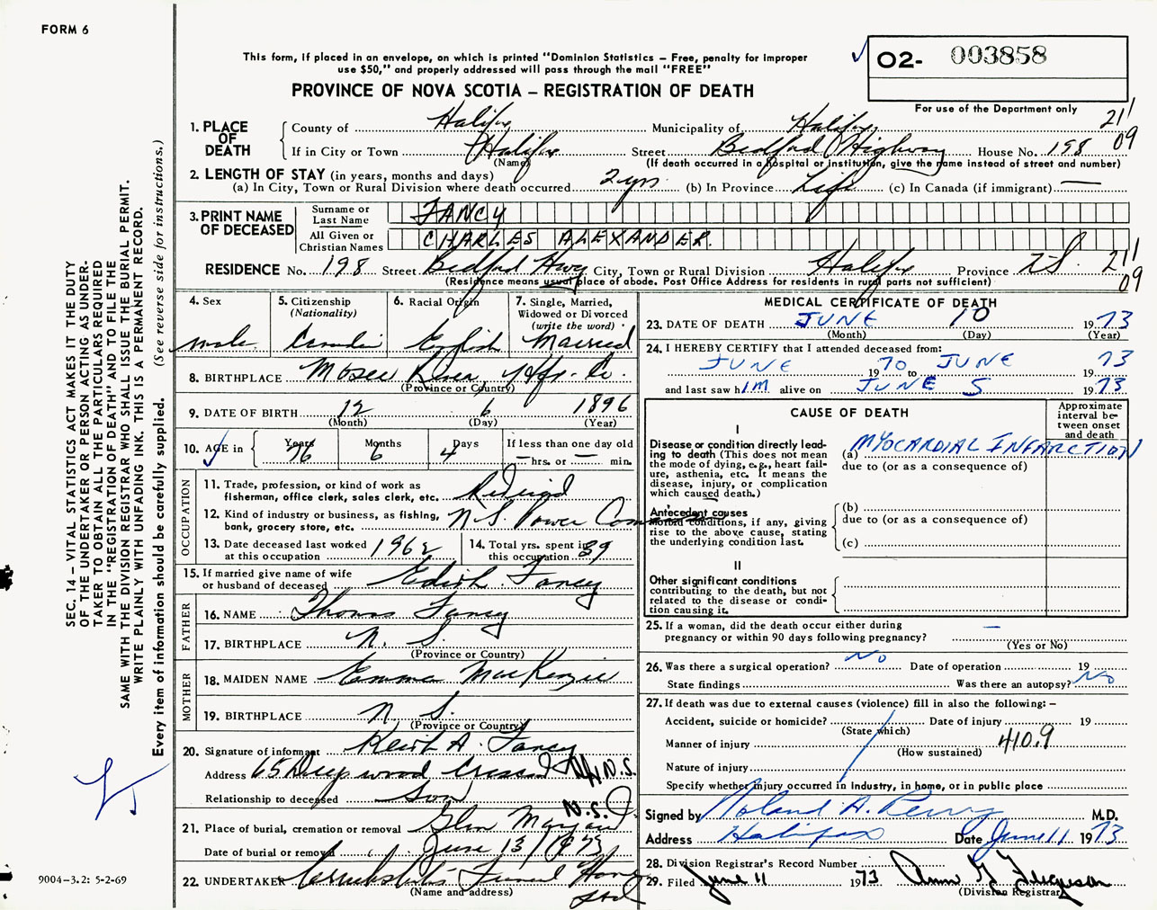 Male Death Registration: Year: 1973 number: 3858