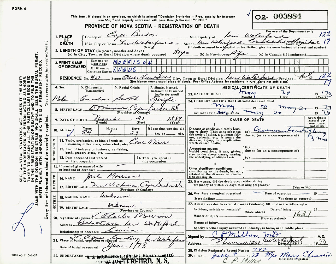 Male Death Registration: Year: 1973 number: 3884