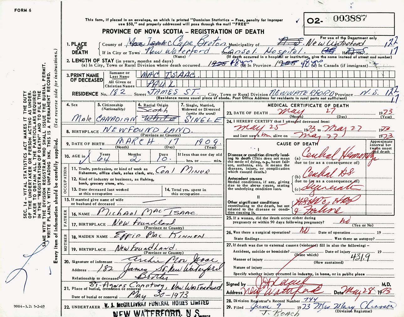 Male Death Registration: Year: 1973 number: 3887