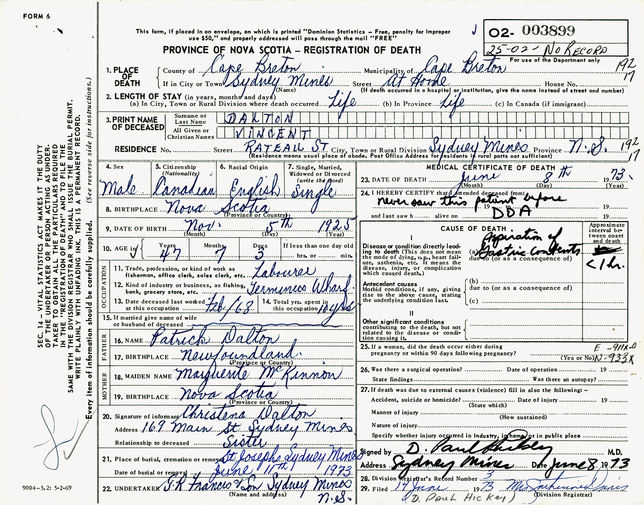 Male Death Registration: Year: 1973 number: 3899