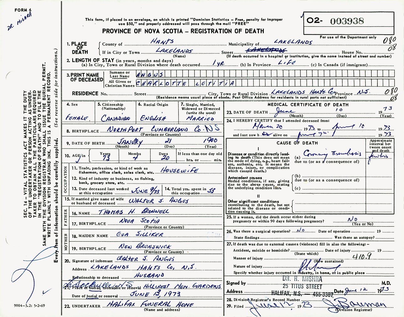 Female Death Registration: Year: 1973 number: 3938