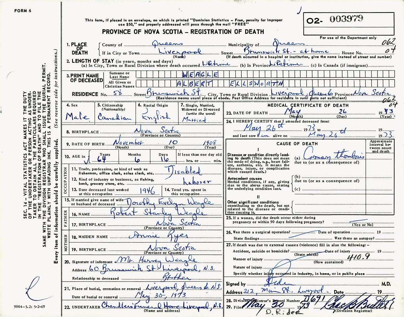 Male Death Registration: Year: 1973 number: 3979