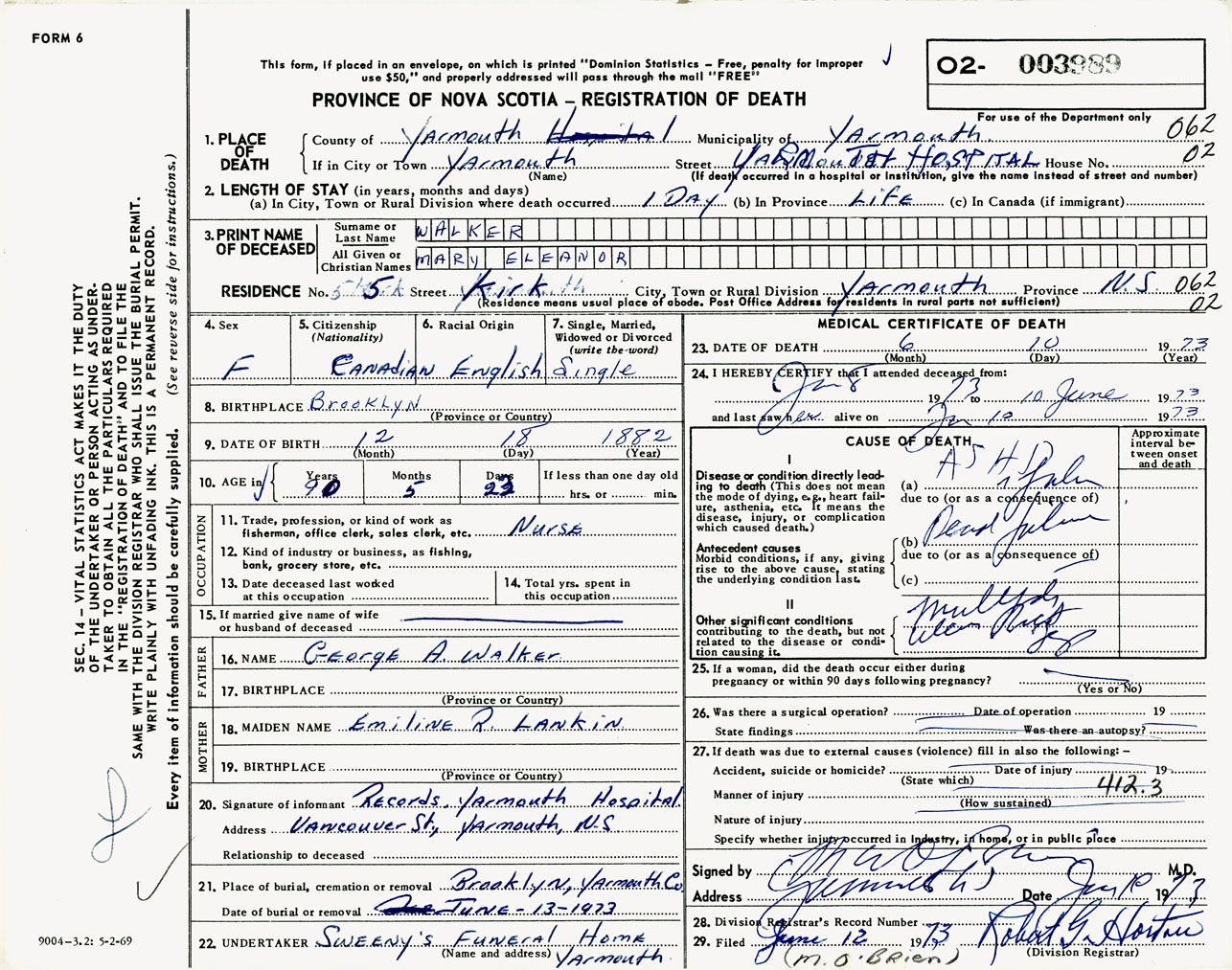 Female Death Registration: Year: 1973 number: 3989