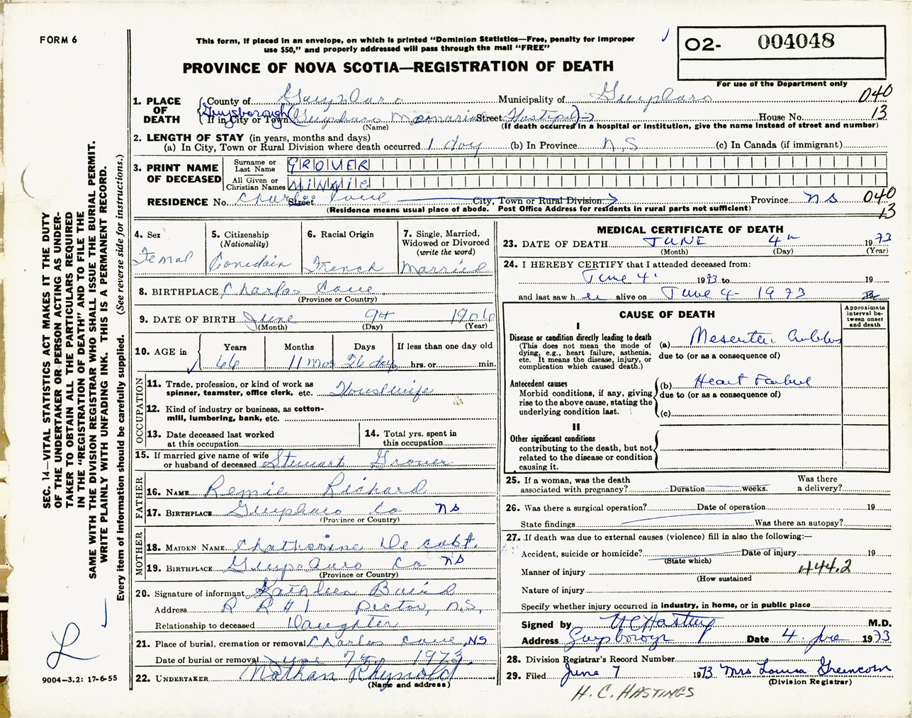 Female Death Registration: Year: 1973 number: 4048
