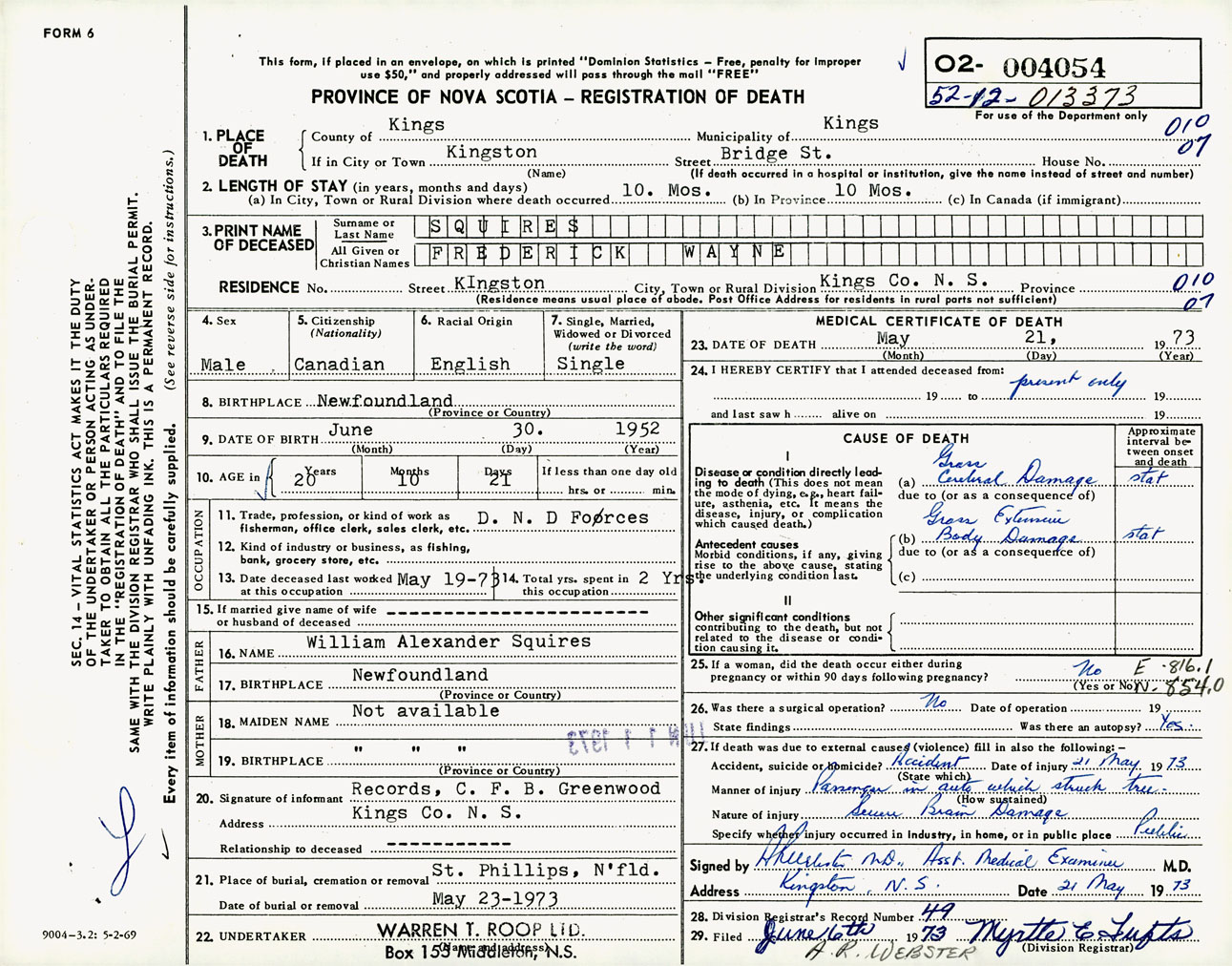 Male Death Registration: Year: 1973 number: 4054