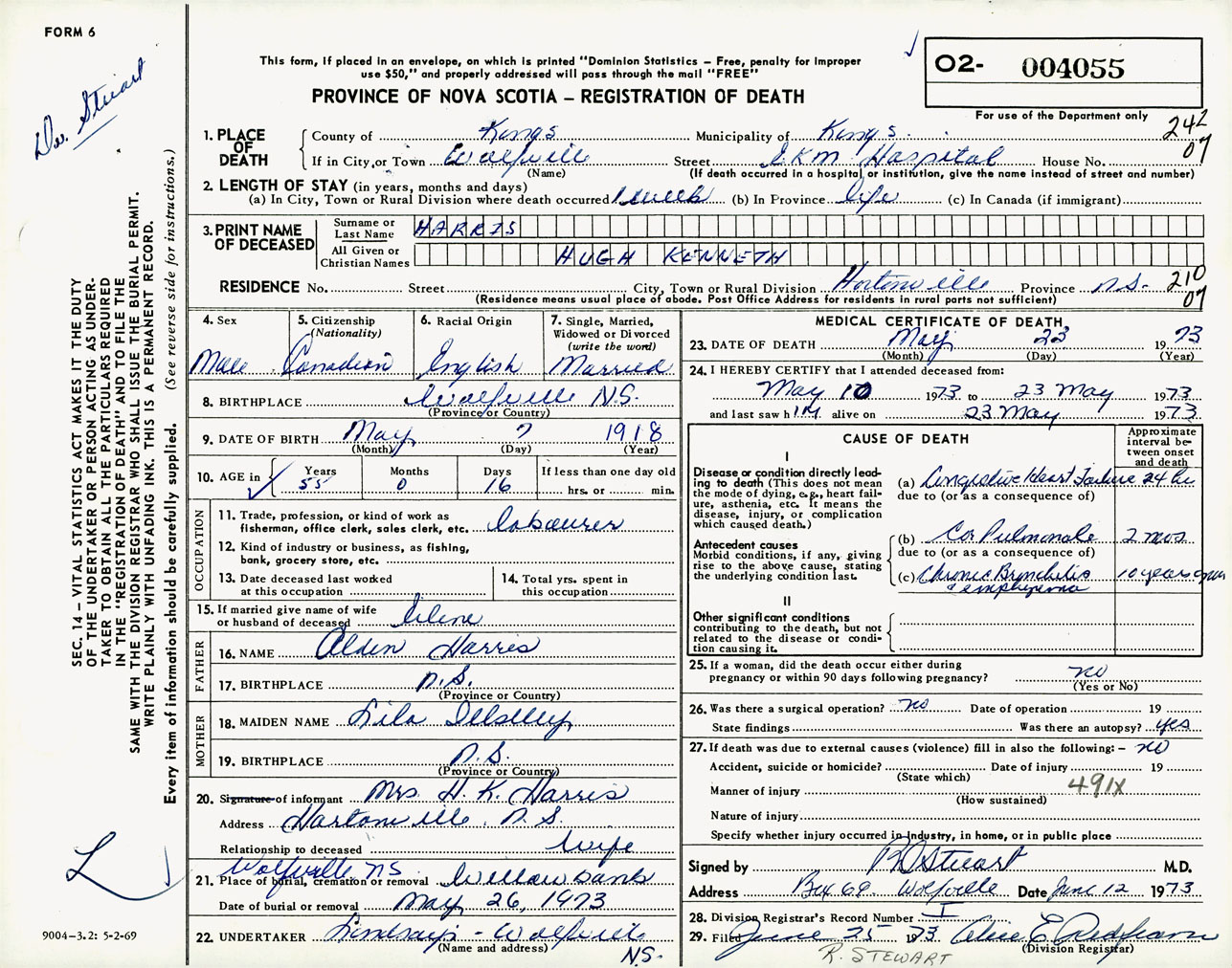 Male Death Registration: Year: 1973 number: 4055